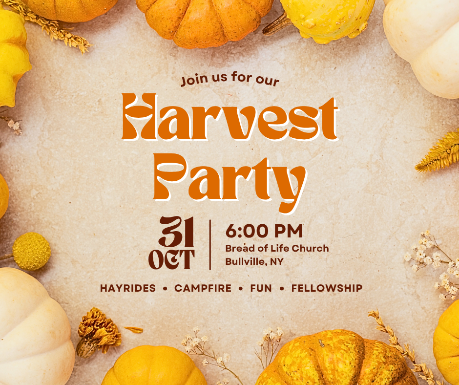 Join us on Friday, October 31 at 6PM for our annual Fall Harvest Party! Games, hayrides, campfire, candy & refreshments! If you can donate candy or snacks, please bring in by 10/26.